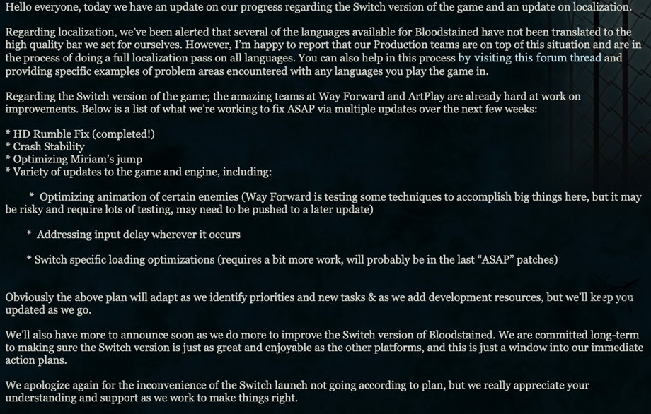 Bloodstained: Ritual of the Night for the Nintend oSwitch, revealing that they will also be doing a full localization pass on all languages.