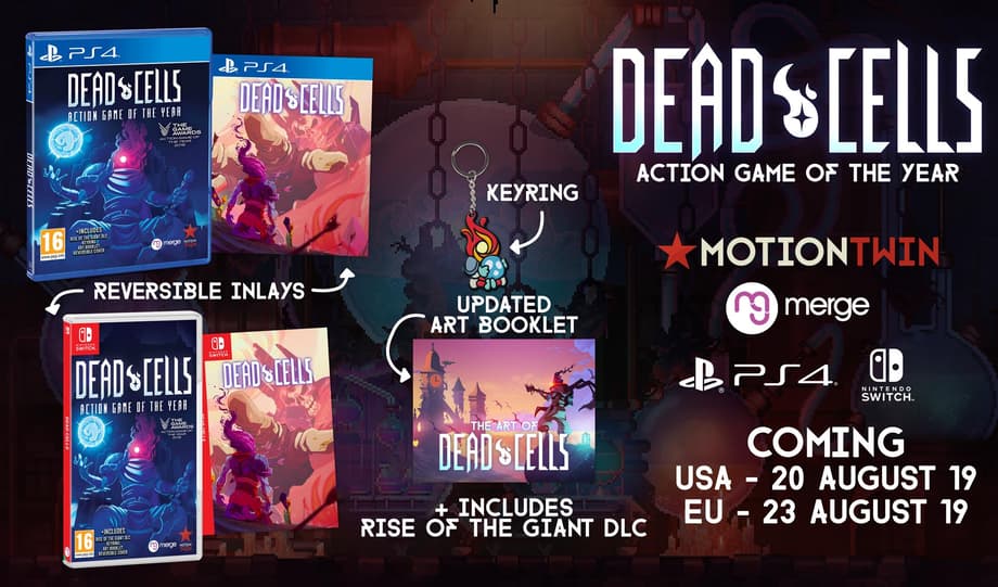 Dead Cells - Action Game of the Year physical edition will be available for the PlayStation 4 and Nintendo Switch, and it will be including a keyring,reversible covers for the game with some awesome new art, the Rise of the Giant DLC, and an updated art booklet.