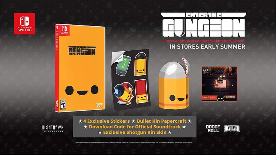 Enter the Gungeon physical edition for the Nintendo Switch includes all of the previously released DLC, an exclusive "Shotgun Kin" skin, 4 exclusive stickers, a Bullet Kin paper craft, Reversible Jacket Artwork, and the download code for the game's soundtrack.