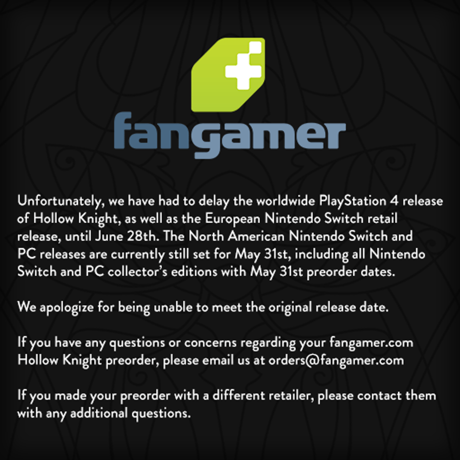 Hollow Knight on the PlayStation 4 worldwide release have been delayed, as well as the Nintendo Switch release in Europe, has announced video game publisher Fangamer today.