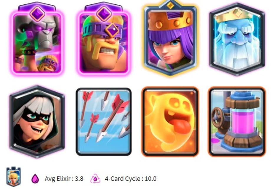 This deck can steal wins and towers in the blink of an eye. This deck is all about preparation and waiting for your opponents to make a misplay. You can prep for a big push by placing your Battering Ram behind your kings and then add a Royal Ghost or Bandit and Healing Spirit when they get to the bridge. You also can play safe and place your Elixir Collector to build up an Elixir advantage to brutally over run your enemy when the time is right. This deck takes a few matches to get the hang of, but once you learn it, it is sure to grant you some quick and easy wins. Here is a video by SirTagCR that teaches you how to play it for some fast learning!