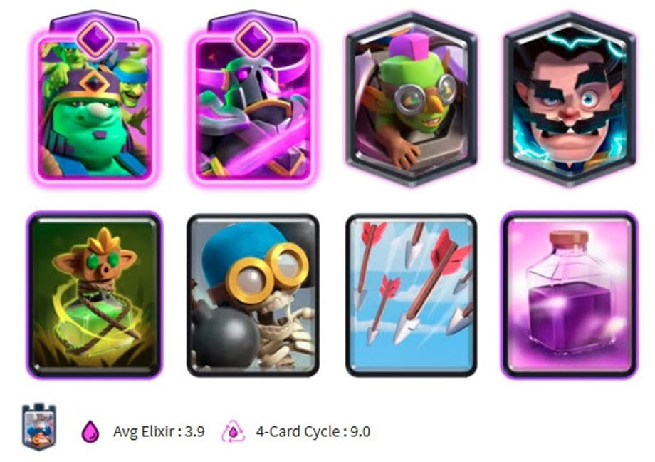 This deck is pretty straight forward in overpowering your opponents with the strength of your Pekka And Goblin Machine. However it has answers to any challenging cards you may face. You have Goblin Curse along with Skeleton Bomber, Arrows Or Even Rage to quickly delete any swarm card attempts to take down your big cards. You also have Electro Wizard to counter Inferno Towers and Sparky that may blow your cards away. This deck is a little on the heavier side with an avg elixir cost of 3.9 and 4 card cycle of 9 elixir, but the power behind these cards makes it worth while.