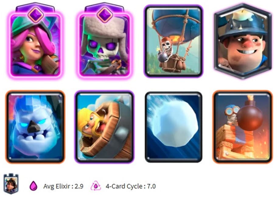 This deck has been popular for over half a year, when the Musketeer Evolution was buffed for a second time. This deck is packing quite the punch with a quick cycle speed as well. This deck has quick answers to Goblin Barrel cheese decks with the Barbarian Barrel, Snowball and Skeleton Bomb Tower. This deck can overtake towers very quickly with the Skeleton Balloon and Evolved Musketeer that can snipe out any strong cards your opponent may put down to counter it. It also has the Miner and Snow Golem and Evo Skeletons to bring quick answers in almost any situation. Here is quick video by Clash Royale Creator Boss_CR that introduces the deck and shows you how to use it effectively.