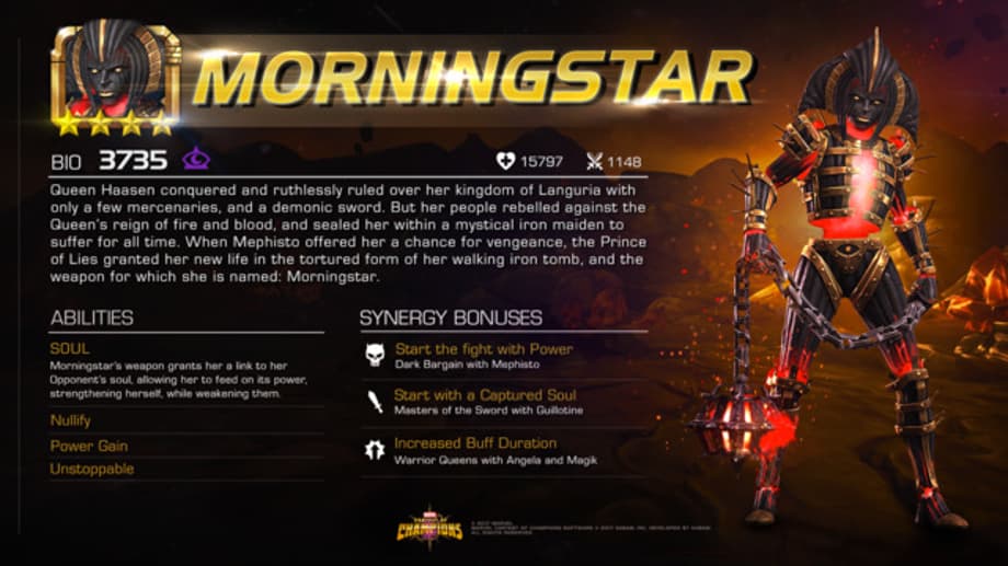 Queen Haasen conquered and ruthlessly ruled over her kingdom of Languria with only a few mercenaries, and a demonic sword. But her people rebelled against the Queen’s reign of fire and blood, and sealed her within a mystical iron maiden to suffer for all time. When Mephisto offered her a chance for vengeance, the Prince of Lies granted her new life in the tortured form of her walking iron tomb, and the weapon for which she is named: Morningstar.