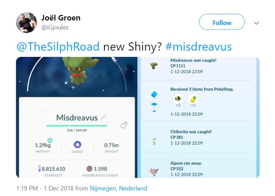 As you can see from the tweet below, fan favorite Ghost Type Pokemon Misdreavus, which usually brandishes a purple-ish/grey coloring now has a shiny variant bearing olive green skin. Of course, this means that players will also be able to capture the adult and evolved form of this Pokemon as well in