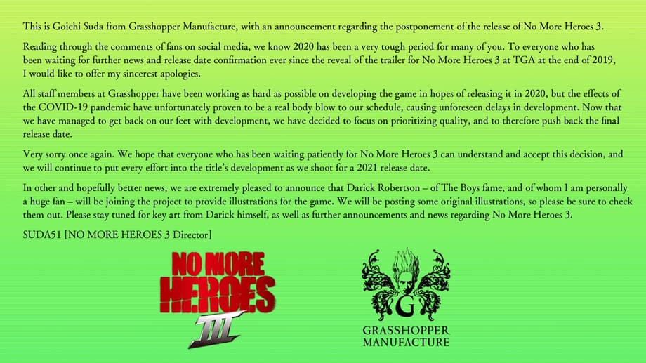 The game's director does mention that the developers at Grasshopper Manufacture are doing the best to release a top quality product, and this led them to the decision of pushing back No More Heroes III until it meets their standards. He also reveals that the team of developers are now targetting 2021 for the release.