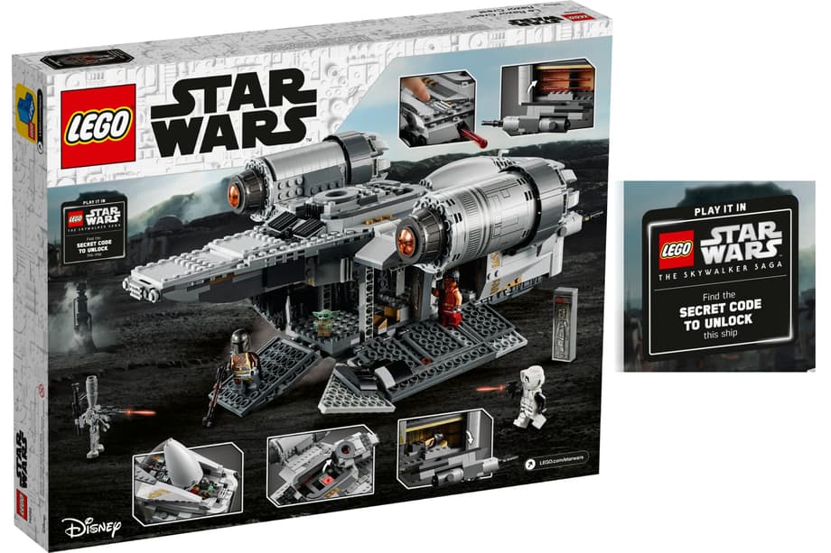 Earlier this month, LEGO unveiled a real set based on The Mandalorian. It's the titular character's ship: The Razor Crest. Those that weren't too busy fawning over the cute, little Baby Yoda microfigure noticed that the back of the set's box said that included within is a code to unlock the ship in the LEGO Star Wars: The Skywalker Saga game — as you can see below (via LEGO).