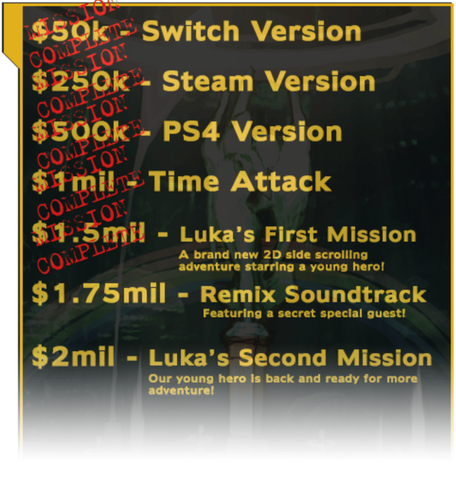 PlatinumGames has also added, now that they've reached the $1.5 million stretch goal, a couple of stretch goals that will be adding a Remix Soundtrack and Luka's Second Mission once they reach the $1.75 million and $2 million stretch goals, respectively — which, at this rate, they'll reach in no time.