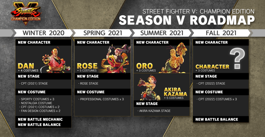 These are only four of the five characters that Season 5 is supposed to be adding to Street Fighter V: Arcade Edition. Capcom confirms that more information about the fifth mysterious character will be revealed at a later date, although it wouldn't be surprising if the announcement would be made at some point halfway through 2021.