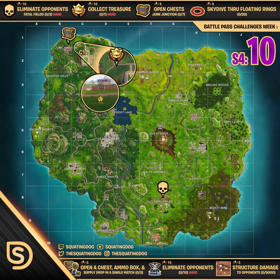 Fortnite Battle Royale's fourth season. Arriving today are the week 10 Battle Pass challenges, the last we'll see of this season. This week's challenges task players with performing stunts like skydiving through floating rings, searching between movie titles, dealing damage to enemy structures, and racking up kills in certain areas of the map, among other things. Check out the Season 4, Week 10 challenges below: