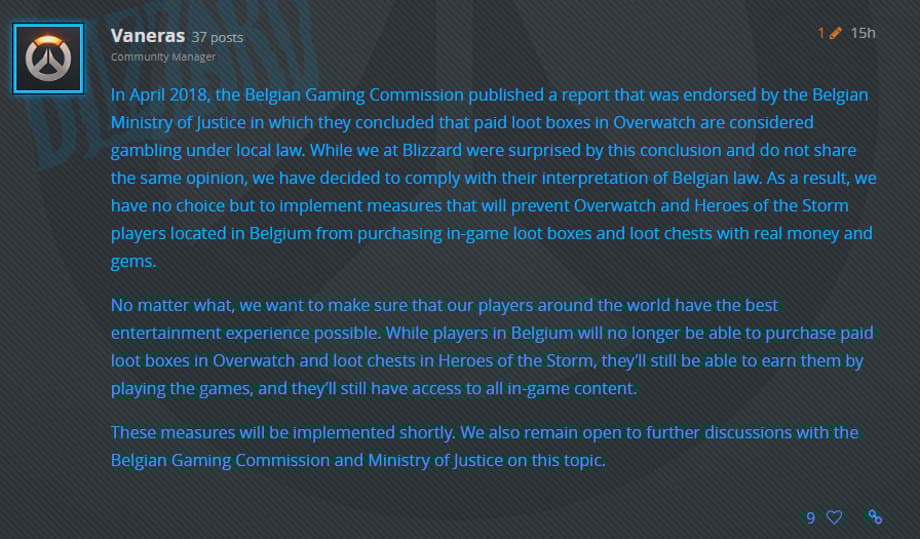 "The Belgian Gaming Commission published a report that was endorsed by the Belgian Ministry of Justice in which they concluded that paid loot boxes in Overwatch are considered gambling under local law. While we at Blizzard were surprised by this conclusion and do not share the same opinion, we have decided to comply with their interpretation of Belgian law. As a result, we have no choice but to implement measures that will prevent Overwatch and Heroes of the Storm players located in Belgium from purchasing in-game loot boxes and loot chests with real money and gems," Vaneras stated.
