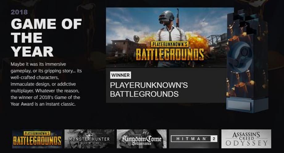 As we previously mentioned, Player Unknown's Battlegrounds (PUBG) took home the top honors, but can guess the 4 other titles they beat out? Click the Next button below to see their identities revealed, along with the winners in the other 7 categories. You can also watch the complete presentation in the YouTube video if you have the time.