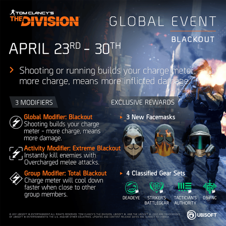 Blackout, which is available right now and will last until April 30. During this event, shooting or running builds your charge meter and more charge means more inflicted damage. The latest limited-time adventure brings new modifiers, vanity masks, and another chance at winning Classified gear-sets!
