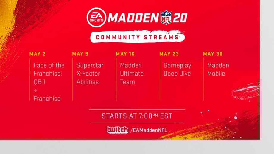 Madden game. The developer has plans to share more details over the course of the next month though scheduled livestream events. Kicking things off on May 2 is a livestream that will focus on Face of the Franchise: QB1 and Franchise Mode.