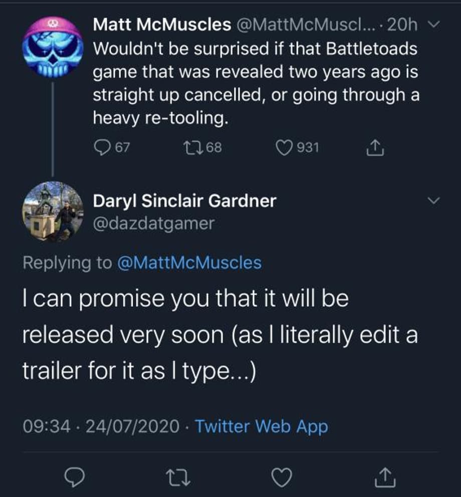 This information actually comes from Daryl Sinclair Gardner, video editor at Rare — who revealed that he's currently editing the new trailer, while responding to a comment on Twitter. It is also worth mentioning that Gardner's tweet has since been deleted, so take that as you deem appropriate.