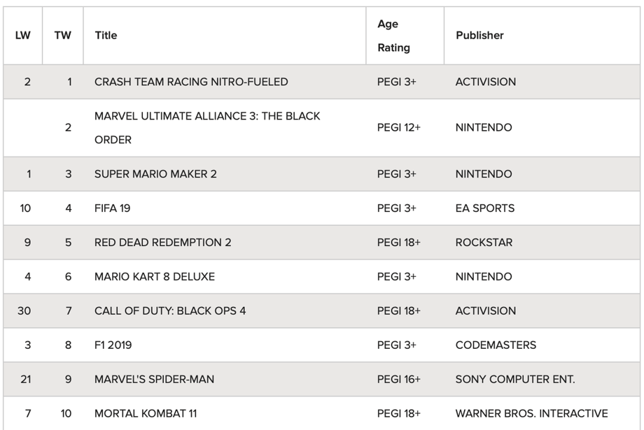 Marvel Ultimate Alliance 3: The Black Order — although it couldn't get to the number one spot in its launch weekend due to, well,