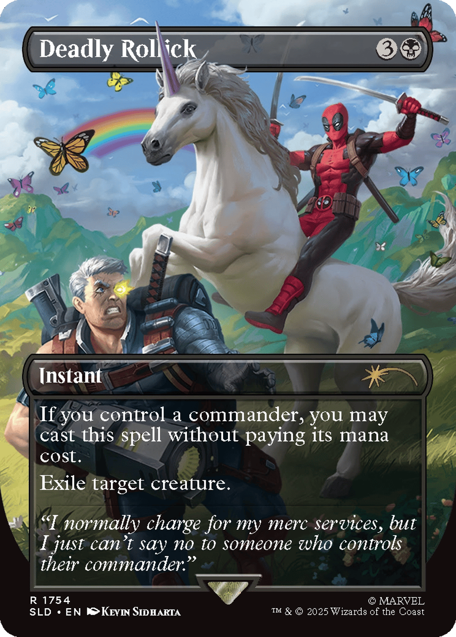 This wild Secret Lair drop includes five unique Magic cards with exclusive Deadpool-themed art. Whether he’s riding unicorns, slicing himself in half, or enjoying space tacos, this drop captures Deadpool’s chaotic essence in true MTG fashion.