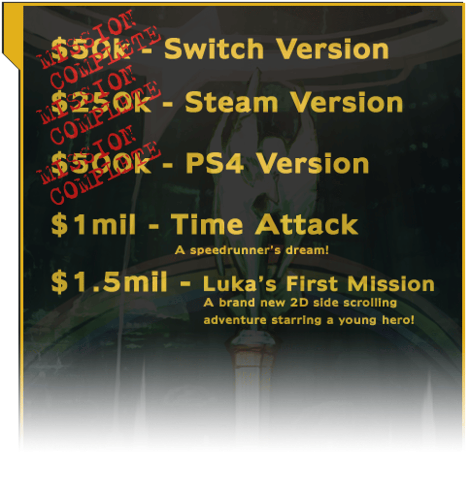 The Wonderful 101: Remastered, only Nintendo Switch, Steam, and PlayStation 4 versions of the game were included, and that the next two stretch goals could end up adding a Time Attack mode, as well as a new 2D side-scrolling adventure titledLuka's First Mission.