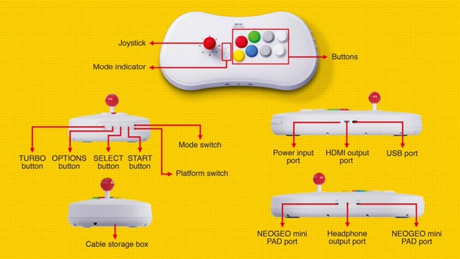 NEOGEO Arcade Stick Pro will feature 20 pre-installed and that its design was inspired by the NEOGEO CD's controller; although it has been enlarged enough to make it a proper fighting stick.