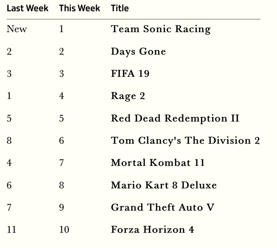 Team Sonic Racing has already managed to join the top charts in the United Kingdom; taking the first place from last week's