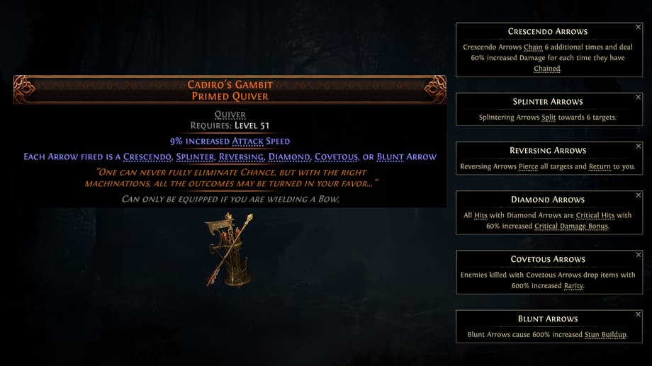 Cadiro’s Gambit (Quiver): A new endgame quiver that embraces risk and reward that is fittingly themed after the legendary trader. Check out the screenshot showing all of the potential this quiver has.