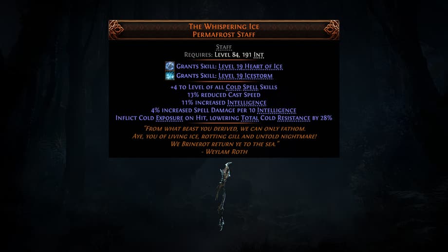 The Whispering Ice (Staff): Offers the Heart of Ice aura and Icestorm spell, blending iconic mechanics with stunning visual design. Check out the screenshots detailing the items stats.