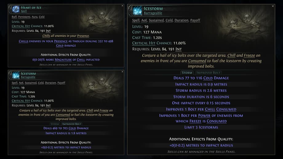 The Whispering Ice provides both the Heart of Ice aura, as well as the Icestorm Spell here is what those do: