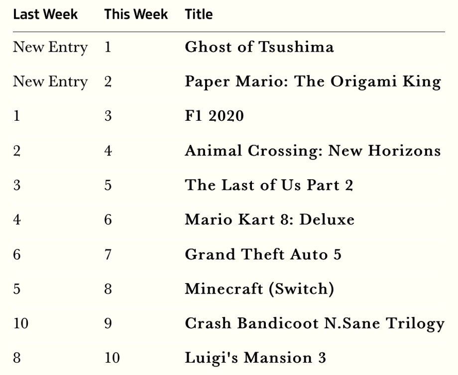 As recently reported by GamesIndustry.biz, Ghost of Tsushima has also managed to slice through the competition in regards to sales in the United Kingdom, comfortably sitting in first place, and comfortably beating Nintendo's Paper Mario: The Origami King, which released on the same day.