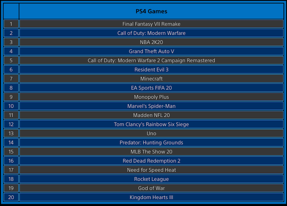 Final Fantasy VII Remke did manage to surpass Activision's Call of Duty: Modern Warfare 2 Campaign Remastered and the remake of Capcom's Resident Evil 3 — which released in March and April, respectively.