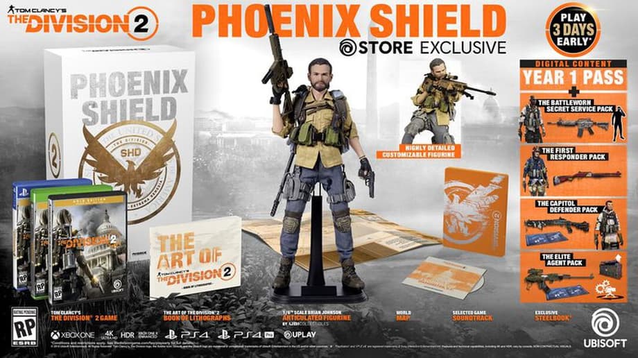 The Tom Clancy’s The Division 2 game, with a 3-day early access to the game starting March 12, 2019, the Year One Pass which comprises 7-day early access to free Year One Episodes, and 3 additional digital packs (Elite Agent Pack, Battleworn Secret Service Pack, First Responder Pack).