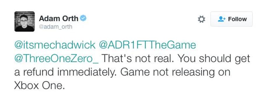 Normally you don't find out that a certain game isn't coming to a certain console by seeing an exchange take place on (of all places) Twitter, but there's a first time for everything. Adam Orth, the man behind the space survival game Adr1ft, revealed that the game wasn't going to be released on Xbox One systems when a follower told him that they had pre-ordered the game. "That's not real. You should get a refund immediately. Game not releasing on Xbox One." Clearly this was a left-hook out of nowhere, as up until now, everyone who was aware of this game was under the impression it would be coming to Xbox One after Three One Zero said it was coming to Xbox One.